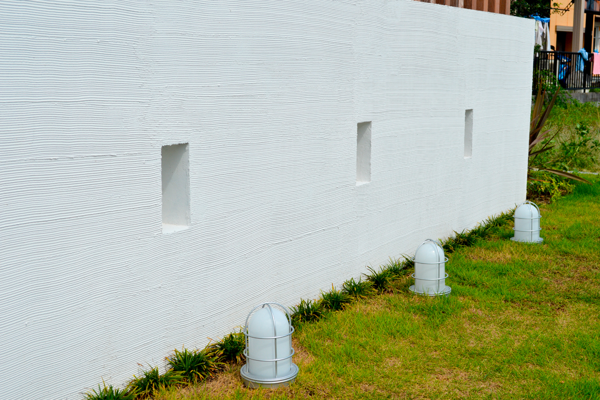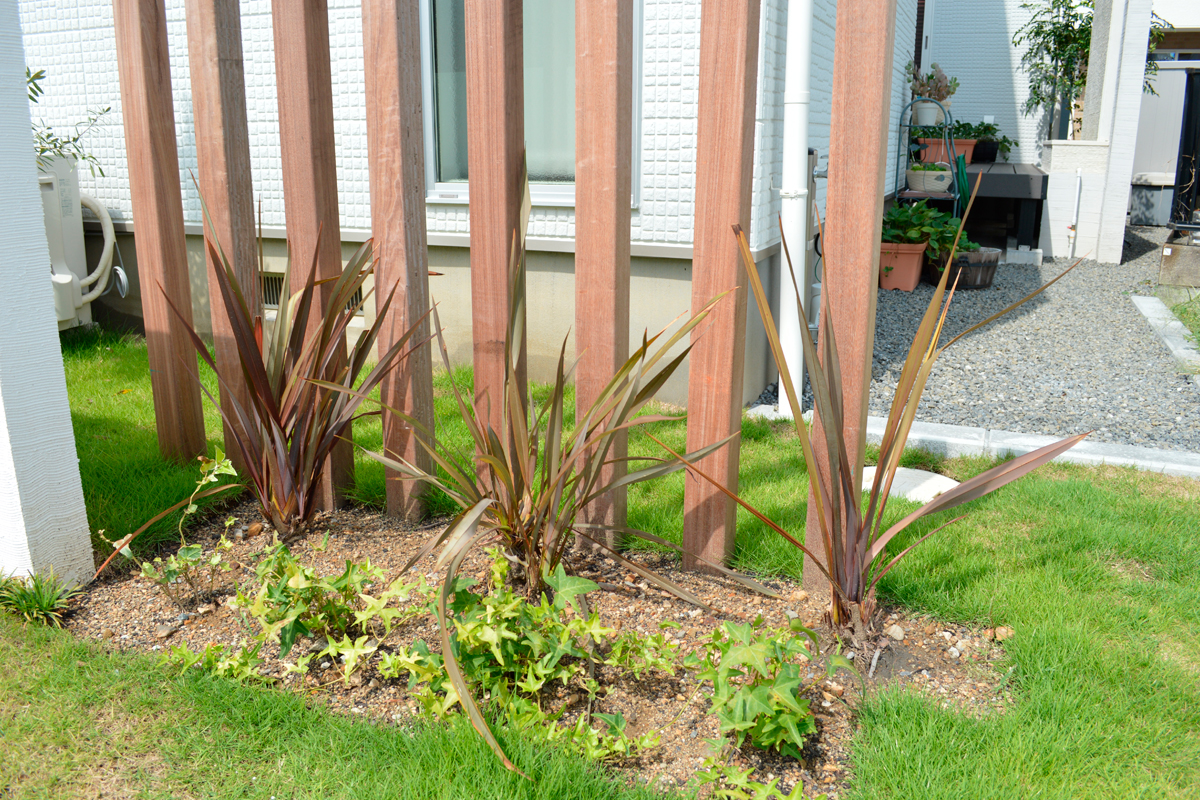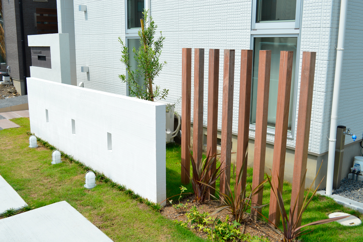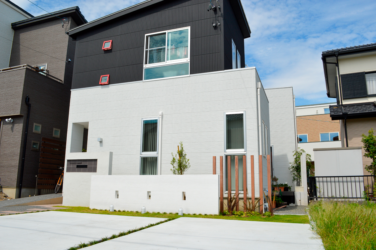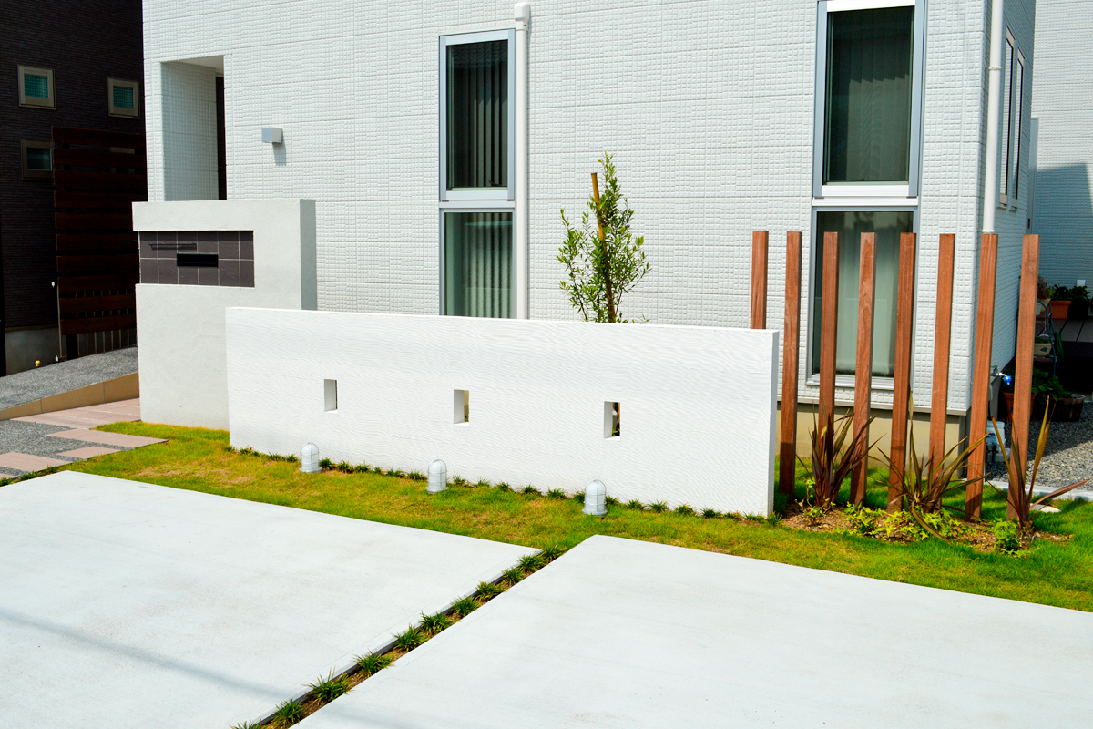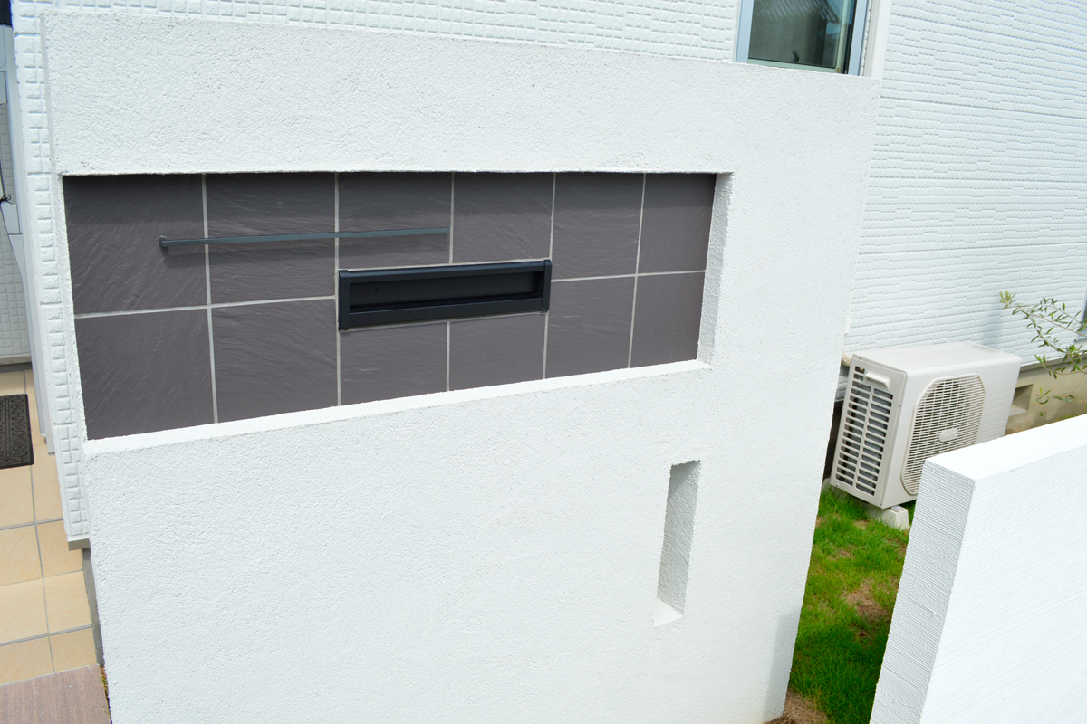 門柱のタイルは建物とリンクさせる為、ホワイト×ブラックで建物との一体感を作ります。