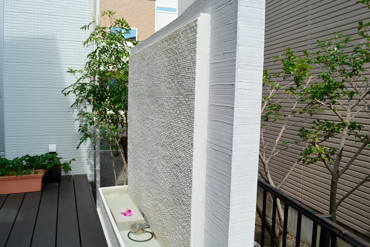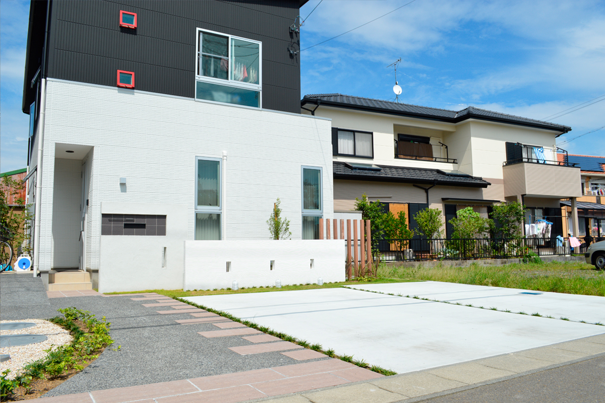 駐車スペースとアプローチとの境は、コンクリートを洗出し仕上げにすることで一気に特別感が生まれます。