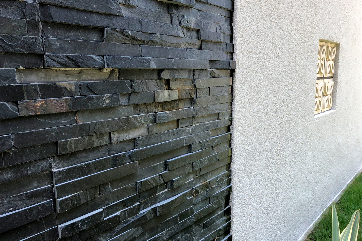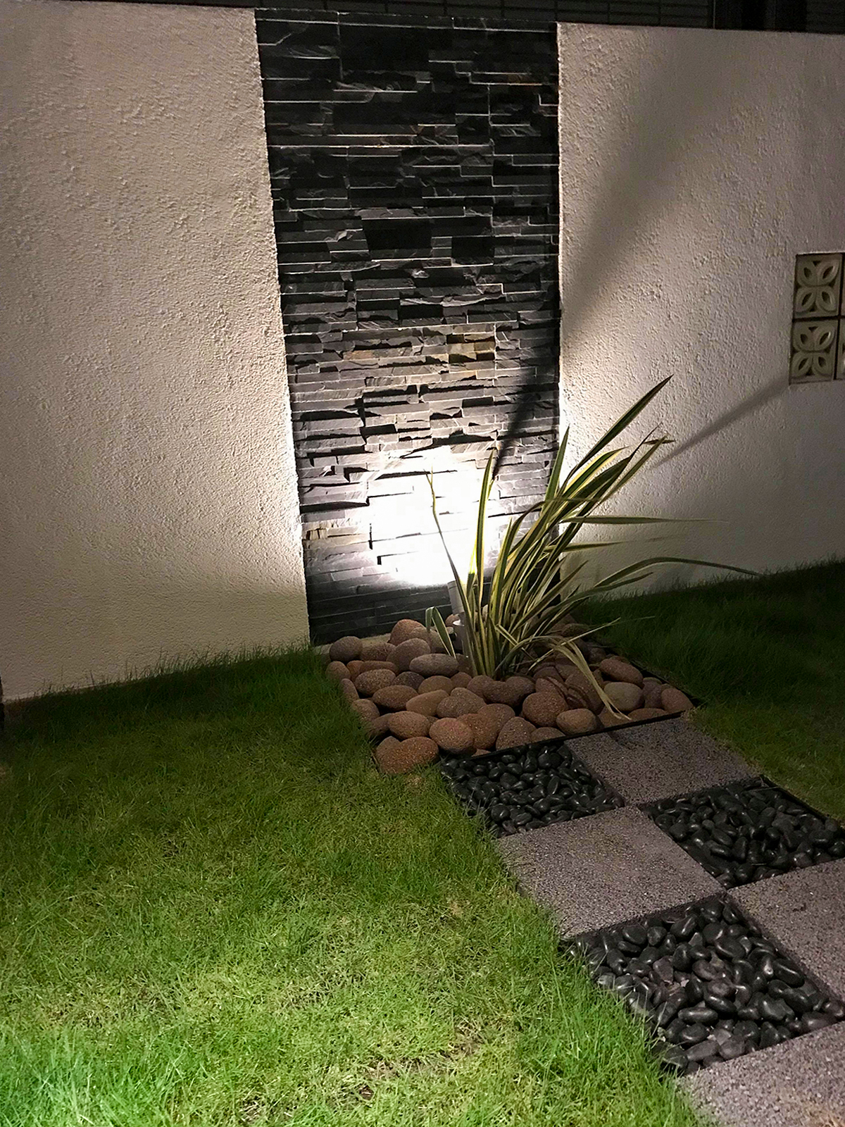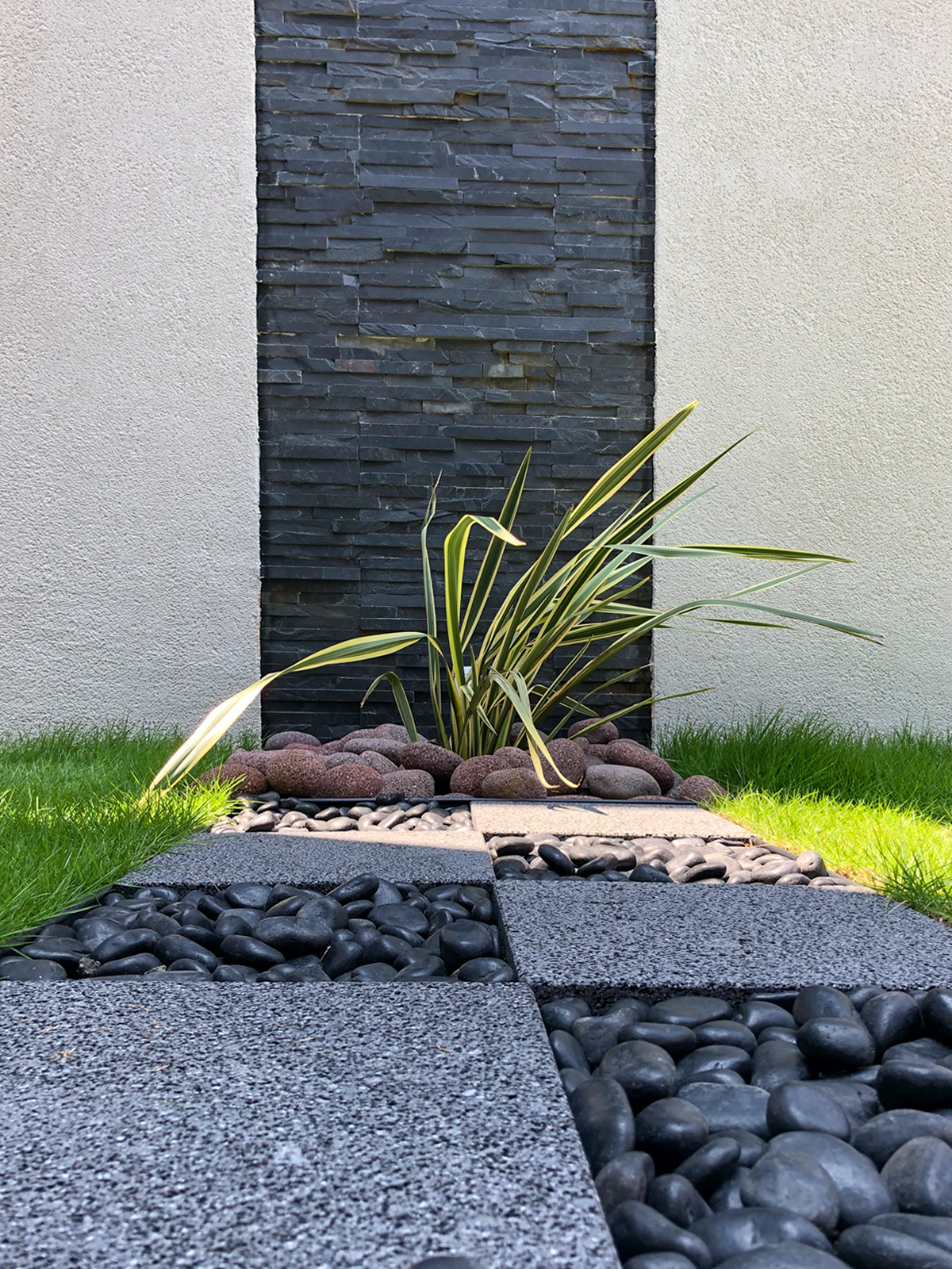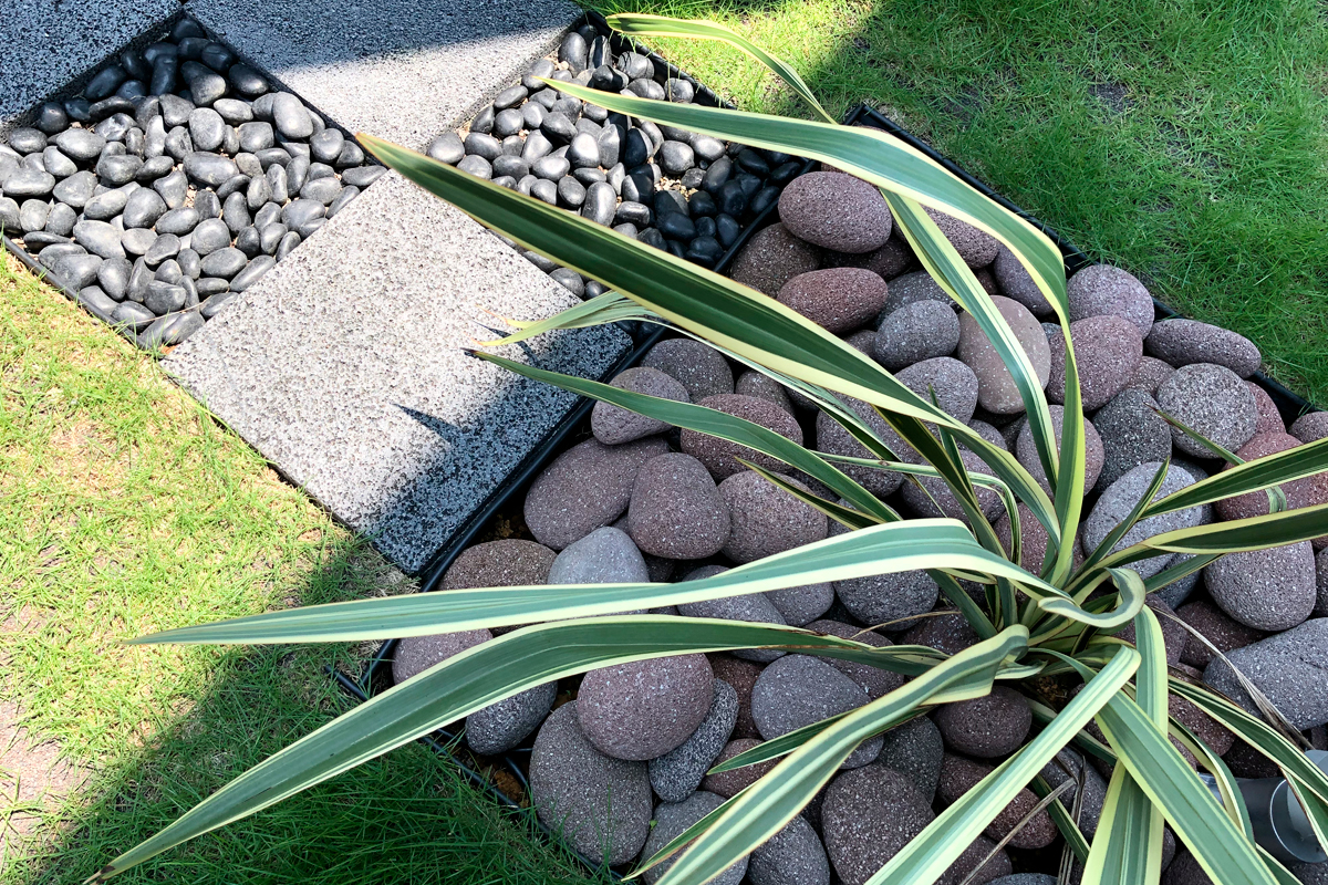 子供だけでなく大人が愉しめる空間になるように、ウッドデッキから伸びる市松模様の石板と黒玉砂利、その先のゴロタ石とニューサイランが一気にリゾート空間を演出してくれます。