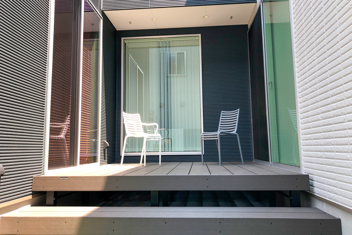 コの字の外壁に囲われたウッドデッキは家族だけのプライベート空間に。